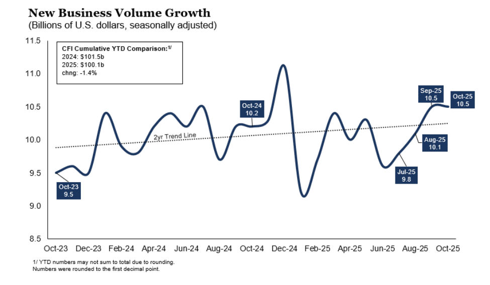 New business volume in equipment finance totaled $10.5 billion in October, up 5.7% year over year and unchanged from September, according to the Equipment Leasing and Finance Association’s (ELFA) CapEx Finance Index, released Nov. 25. New business volume was down 1.4% YoY through the first 10 months of 2025.