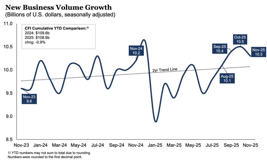 Total new business volume reached $10.3 billion in November on a seasonally adjusted basis, down 1.9% month over month but up 1% year over year, according to the latest CapEx Finance Index released today by the Equipment Leasing and Finance Association (ELFA). Year-to-date volume declined 0.9% YoY.