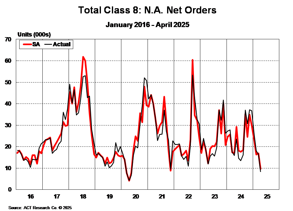 North American Class 8 truck net orders dropped 48% year over year in April to 8,200 units.