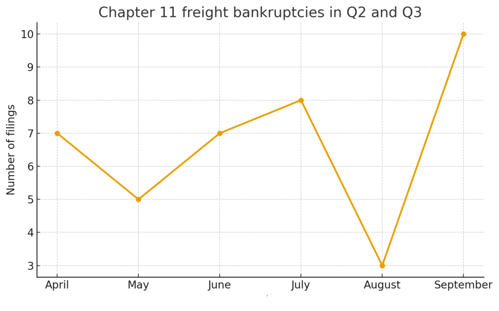 The 21 filings in Q3 follow 20 in Q2, highlighting the yearslong freight recession that’s been prolonged by tightened lending standards, rising operating costs and geopolitical uncertainty. September’s 10 filings were the most in a month since the start of Q2, followed by eight in July, seven in both April and June, five in May and three in August.
